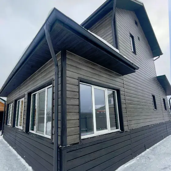 Ваш дом — это отражение вашего вкуса и статуса. Металлический сайдинг Евро-Брус под дерево Винтаж с премиальным покрытием SteelArt придаёт фасаду солидность и естественную красоту благородного массива, а цоколь в цвете Черное Дерево 3D покрытие Принтек подчёркивает выразительный контраст и надежность. Такое сочетание выглядит не только эффектно, но и гарантирует долговечность и защиту от любых капризов погоды. Этот дом привлекает взгляды и вселяет уверенность, что инвестиция в его стиль и комфорт полностью оправдана.