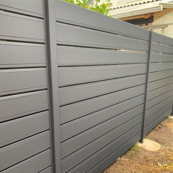 Забор в стиле ранчо из металлопланкена в оттенке RAL 7024 MATTE Серый графит матовый. Элегантная фактура металлических ламелей подчеркивает современный стиль ограждения, а вставки из прозрачного поликарбоната добавляют легкости и визуальной открытости конструкции. Такое сочетание материалов обеспечивает не только надежную защиту участка, но и создаёт эстетически привлекательный облик, гармонично вписывающийся как в частные, так и в коммерческие архитектурные решения.